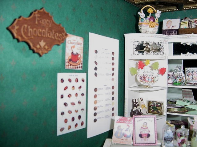 I started this shop many years ago. I have collected chocolate pieces made by Betsy Niederer, Lola Rener and Kerry Alexander for this shop. I also made all the Godiva chocolate boxes, bags, posters and chocolates that have the Godiva logo on it. The chandeliers were made by Tim Kraft and the litte girl dolls by Bonnie Justice and Carol Mcbride.